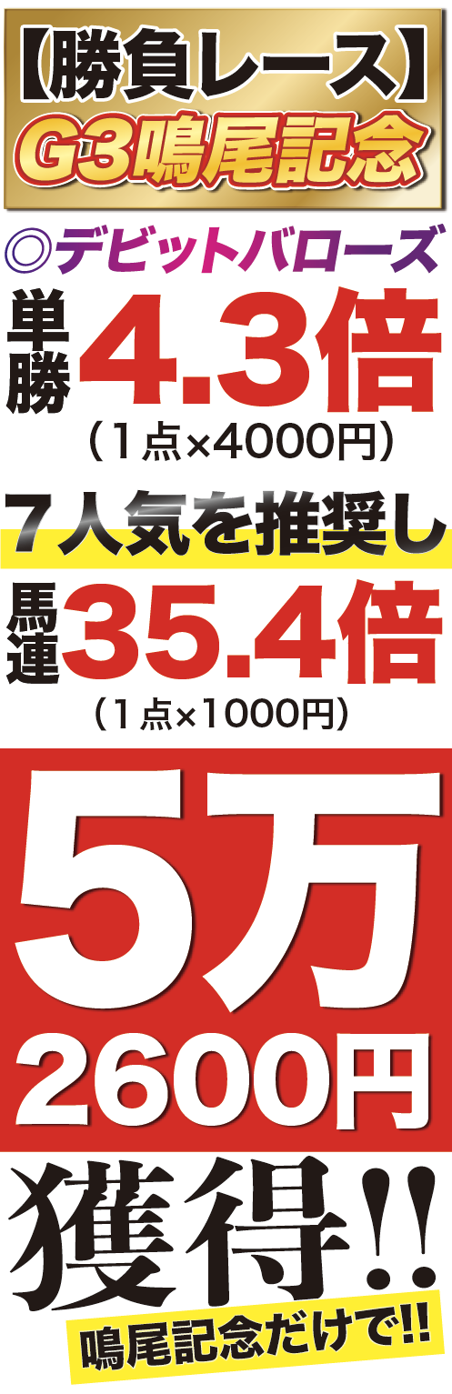 ※勝負レースではございませんので、1点あたりの【資金配分】に関しましては、お客様のご予算内にて、ご自由に選択ください。