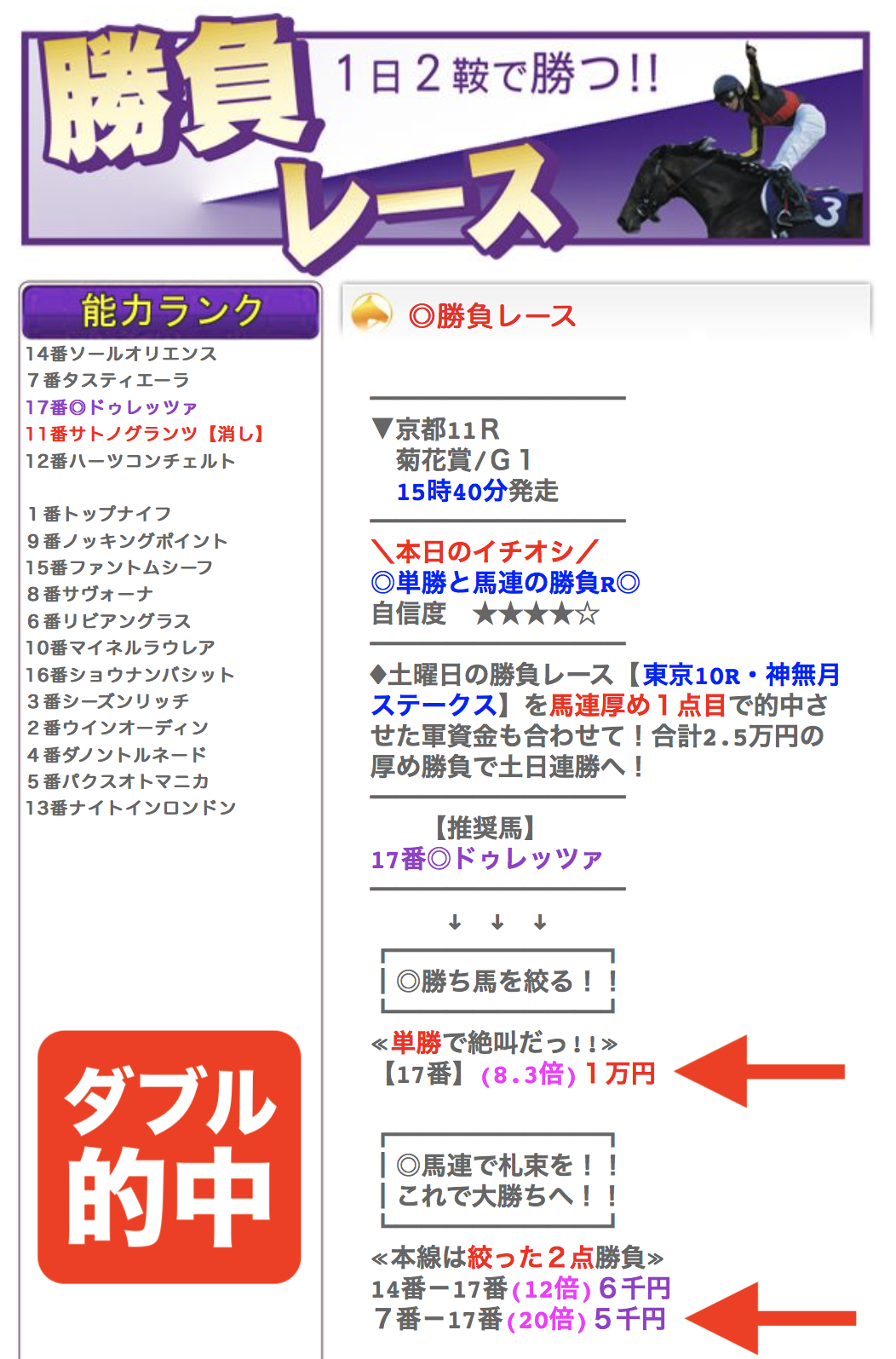 ※勝負レースではございませんので、1点あたりの【資金配分】に関しましては、お客様のご予算内にて、ご自由に選択ください。