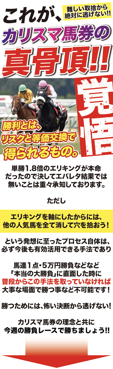→だからこそカリスマ馬券は、ただ馬券を買って当てるだけではなく、必ずどのレースでも