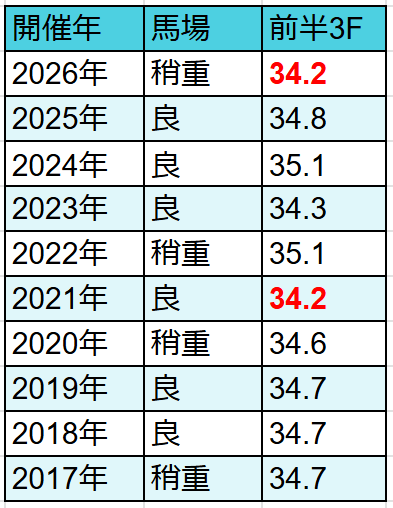 ただし、同じく34.2だった2021年は「良馬場」対して今回は「稍重」。