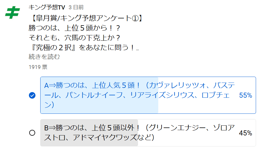 実際に、キング予想TVで行った「勝ち馬」についてのアンケートでも、以下の通り「人気馬と伏兵の評価にそれほど大きな差がない」といったような結果が出ていた。