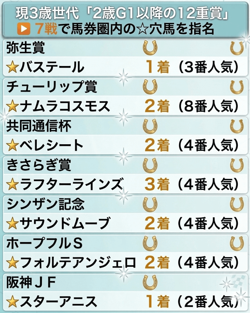 現在の3歳世代でいえば!昨年末の2歳G1以降に行われた12重賞のうち、半分を超える「7頭の☆イチオシ馬」が馬券に絡んでいる実績があるのだ!