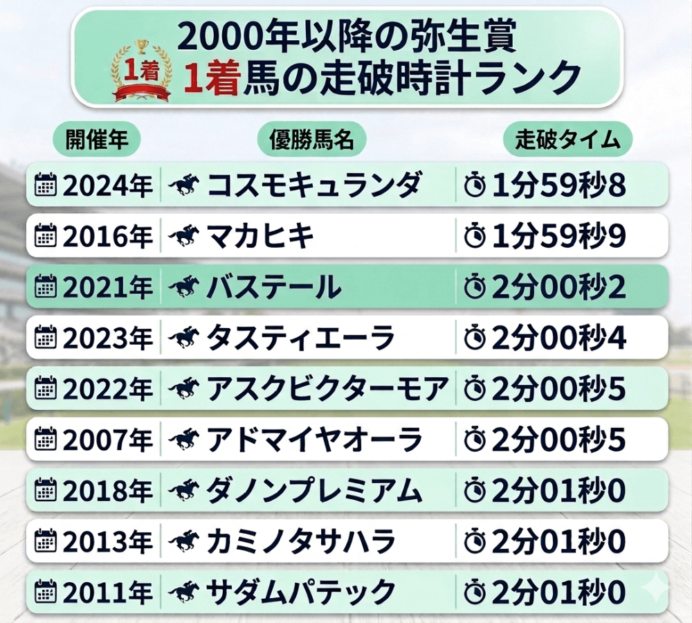 ほとんどの年は「2分0秒台以降」の決着になる前者に対し、後者は「1分57秒台の勝ち馬」も出ている。たった1ヶ月しか違わないのに。
