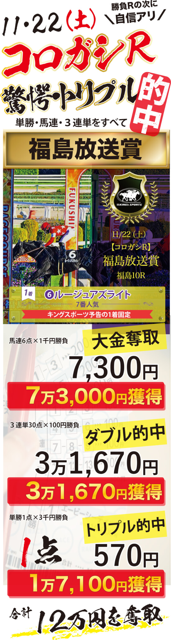 「穴の最終レース」では、トコトン攻めて、3連単なら最低5万馬券以上を狙っていく!実際に結果を出してきました。