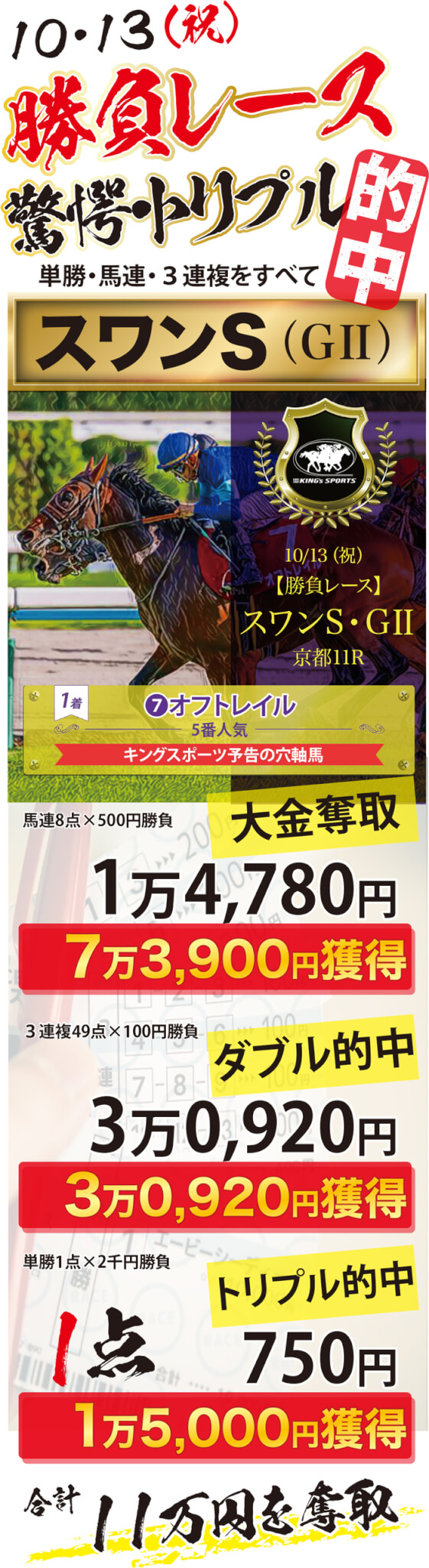 ㊗️回収率900%超え➡【スワンS】トリプル的中で11万円奪取🏆さあ【秋華賞】も穴のキングスポーツに黙ってついてこい💪💪💪
