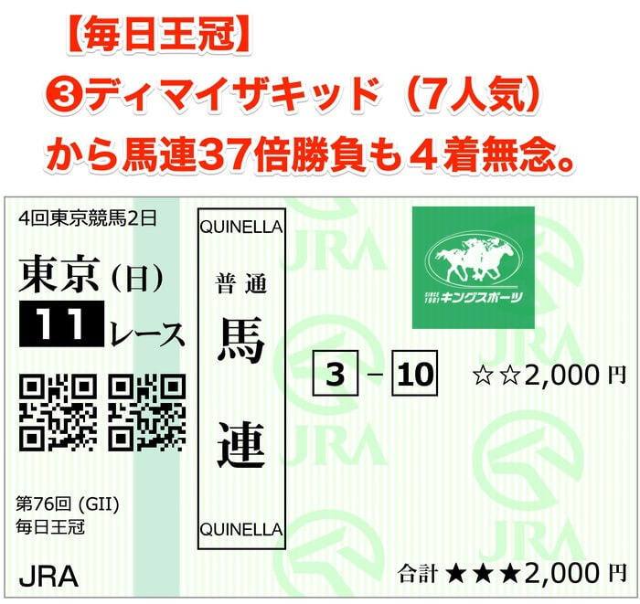 例えば【毎日王冠】は「堅いレース」と言われながら、私たちらしく夢を求めて攻めました。結果的には不動の軸馬で7番人気の大穴☆ディマイザキッドが無念の4着。