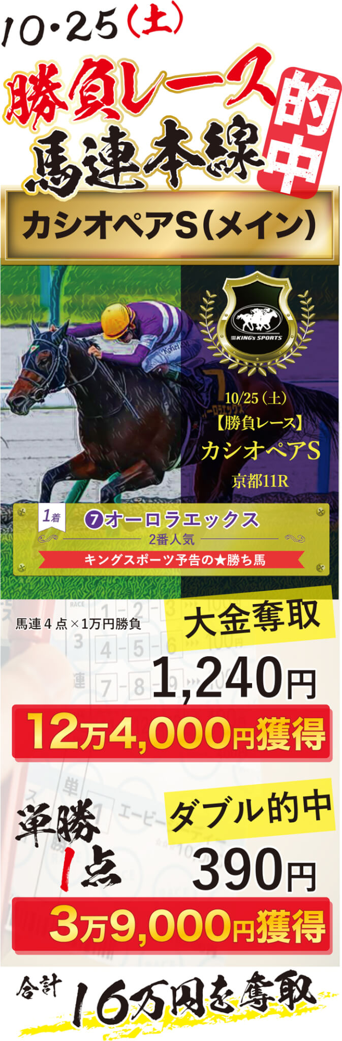 (土)勝負レース【カシオペアS】において、馬連の絞った4点で1,240円を射止めたかと思えば(日)にはキング得意の1点勝負を2連発!