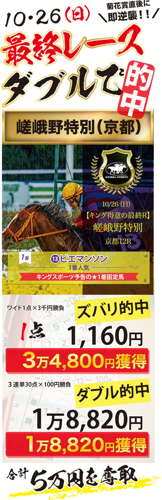 先日の重賞【スワンS】での馬連・万馬券的中(回収率900%)を筆頭に、秋ケイバで快進撃を続けるキングスポーツですが、10月最終週となった先週、またも勝ちました!