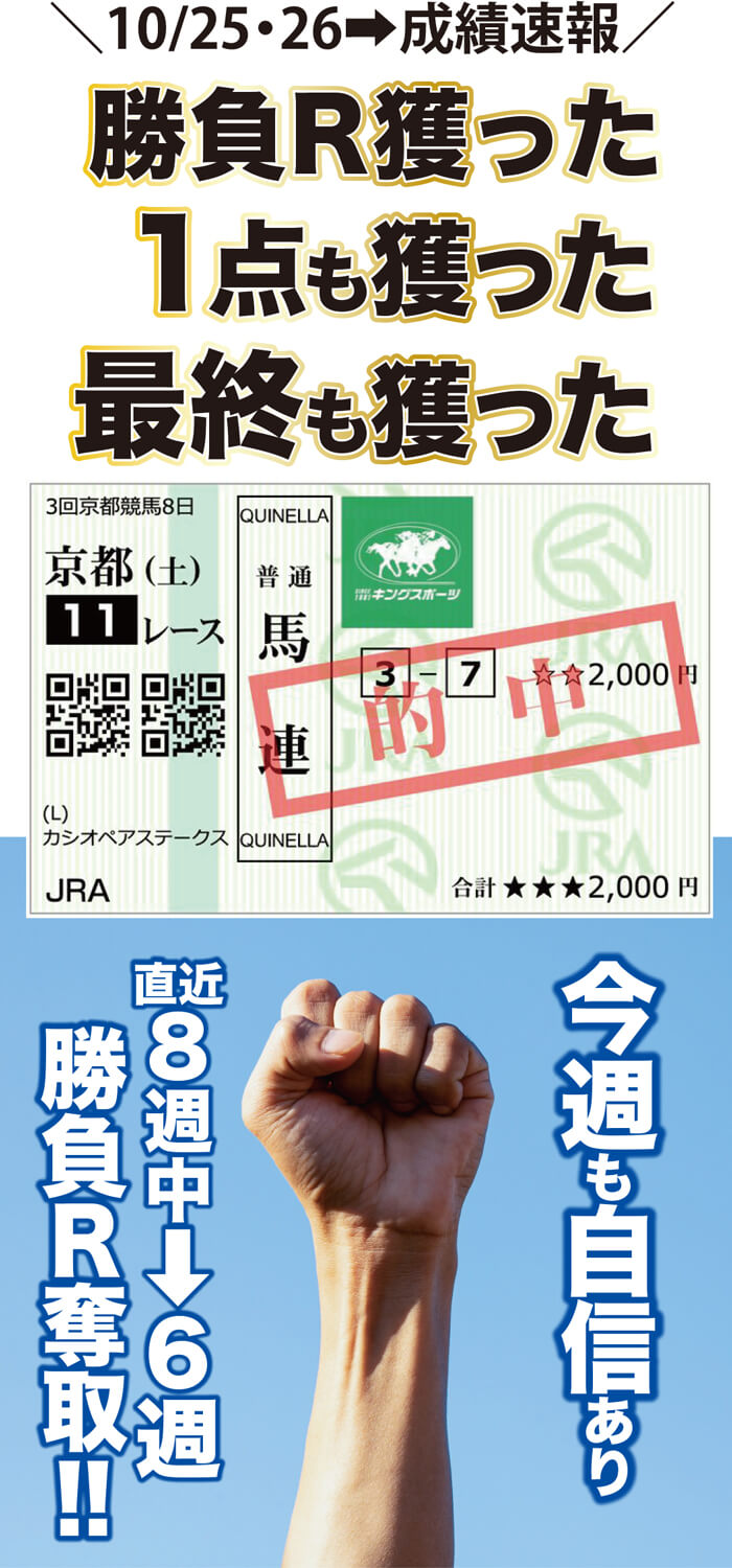 先日の重賞【スワンS】での馬連・万馬券的中(回収率900%)を筆頭に、秋ケイバで快進撃を続けるキングスポーツですが、10月最終週となった先週、またも勝ちました!