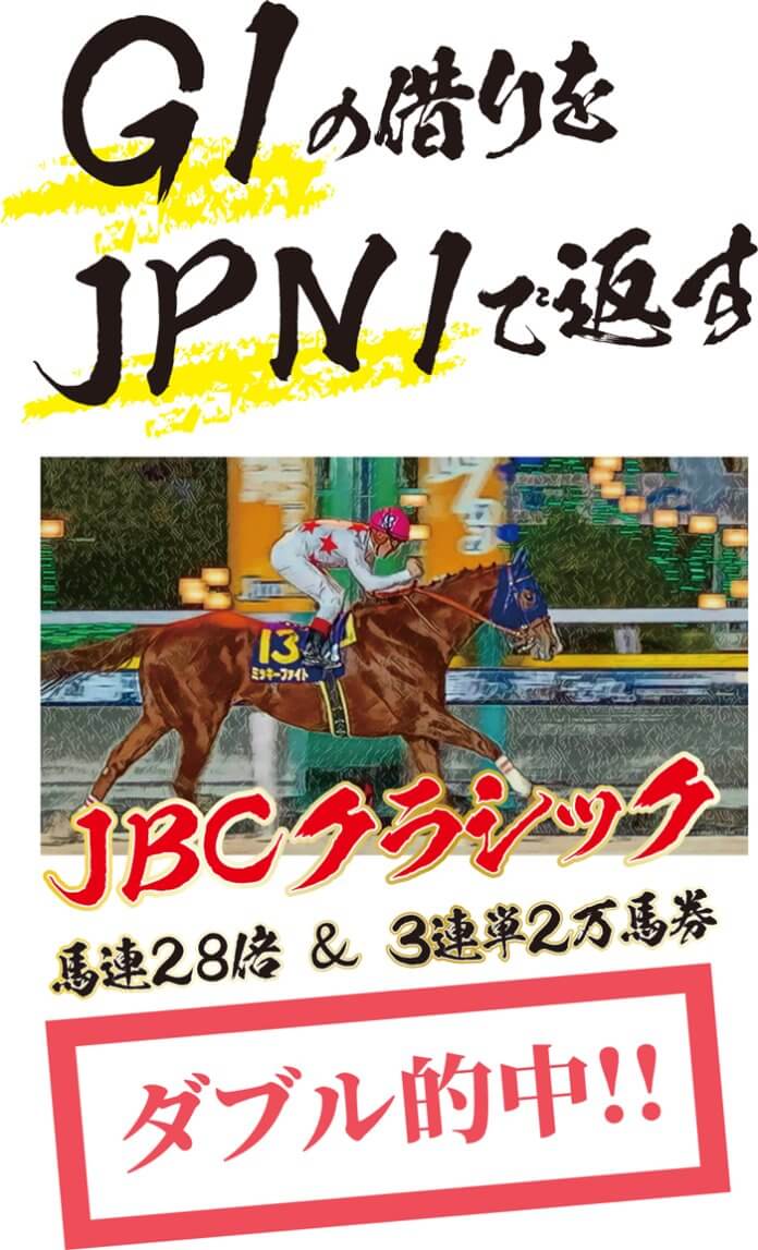 冒頭からご紹介の通り「G1の借りはJPN1で返す!!」ということで11/3【JBCクラシック】において、馬連2点で2,830円&3連単10点で2万5,410円の「好配当ダブル的中」に成功!!この破壊力こそ「キングスポーツそのもの」