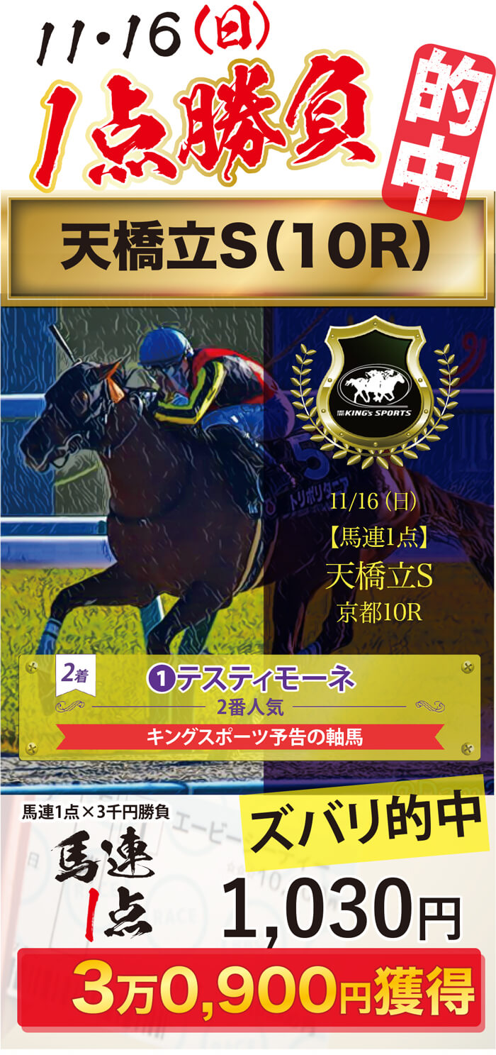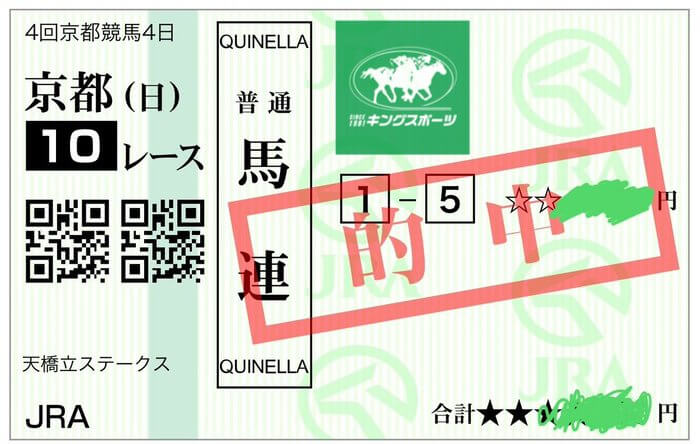 まず、先週(日)京都10R【天橋立S】では、この夏のキング予想改革により存在感を増してきた「1点勝負」で、馬連1,030円を獲得!