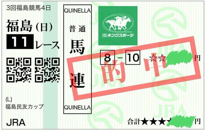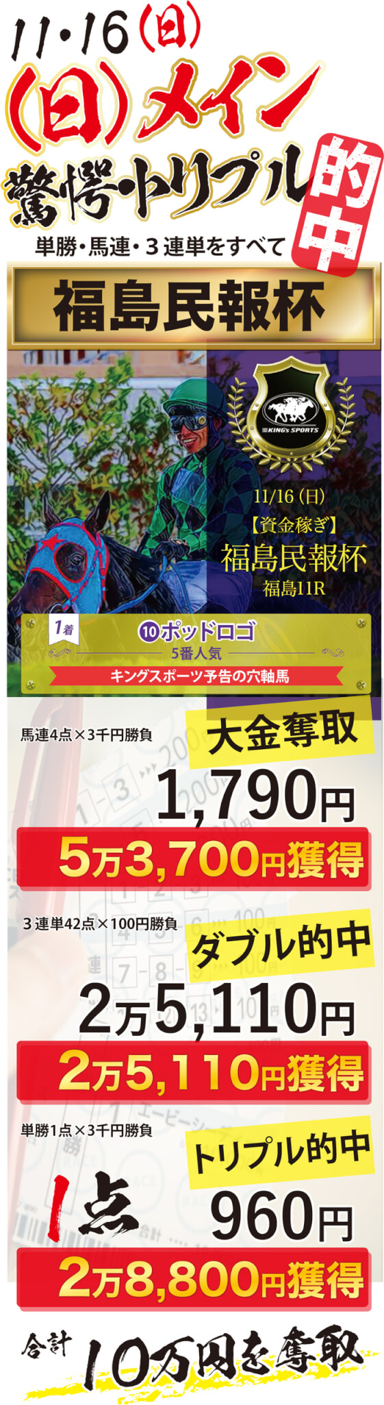 続く勝負どころのメーンレース【福島民友C】では、馬連4点1,790円、3単42点で2万5,110円、単勝1点960円のトリプル的中に成功し、このレースだけで10万円の獲得!