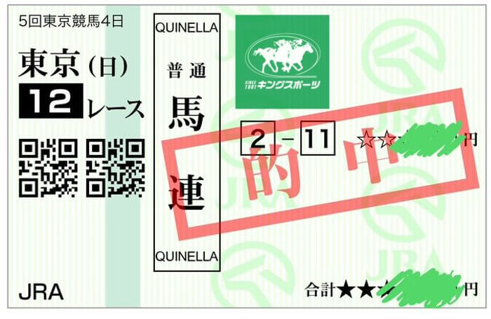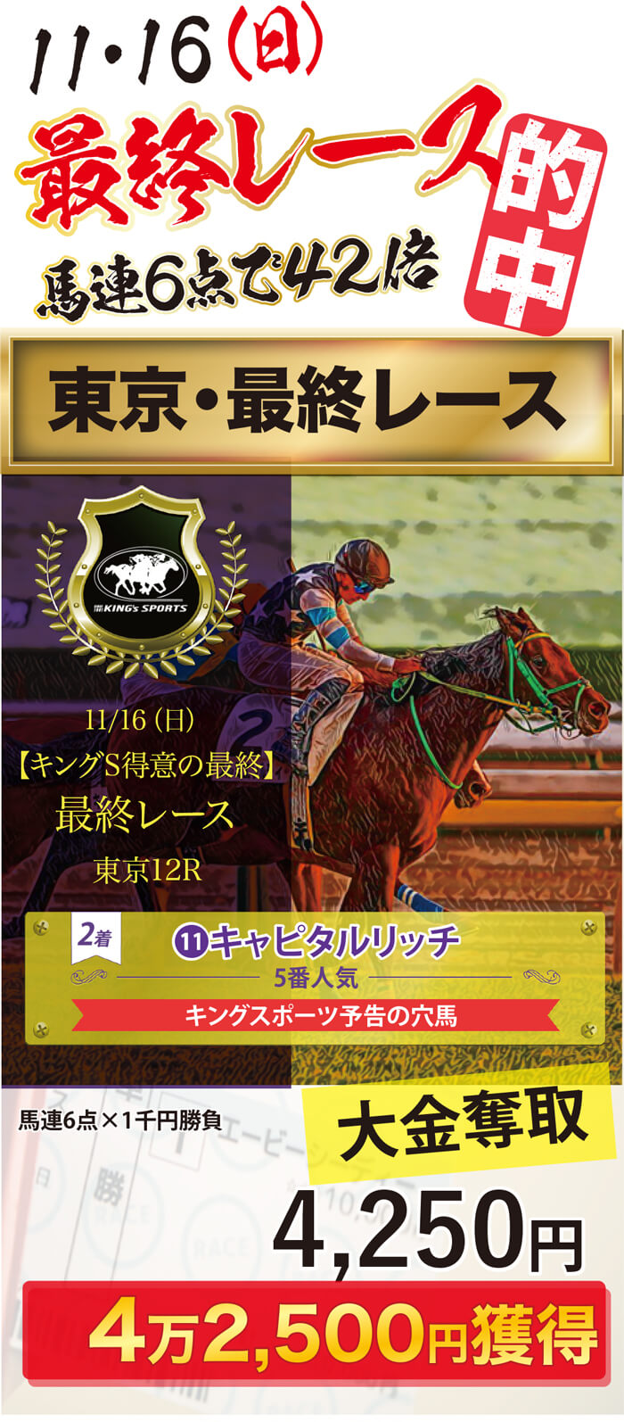 さらに、キング得意の最終12レース(東京)では、馬連6点で4,250円という穴馬券をゲット!