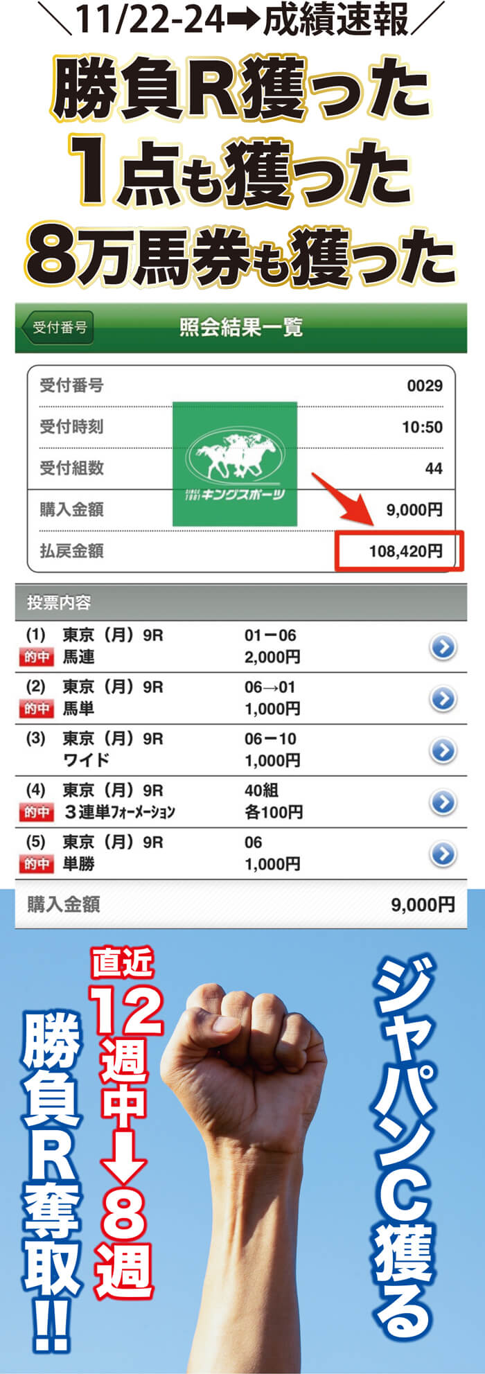 ホーム先週の成績と獲得金額㊗️重賞の勝負R 獲り➡1点も獲り➡8万馬券も獲った!【直近12週中➡8週】勝負レース奪取🇯🇵ジャパンC🇯🇵運命の2点で勝つ!