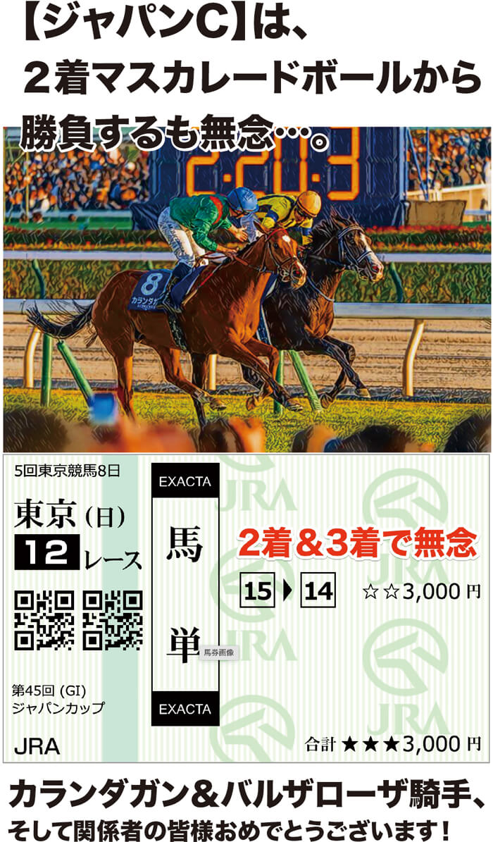 もちろん、競馬ですから、上手くいくレース、いかないレースはございます。例えば【ジャパンC】も「2着→3着」で馬券を逃し、猛省しております。