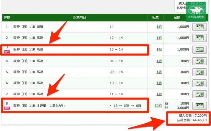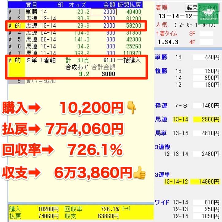 これにより、馬連大本線の1点目で2,960円&3連単30点で1万4,860円のダブル的中に成功。