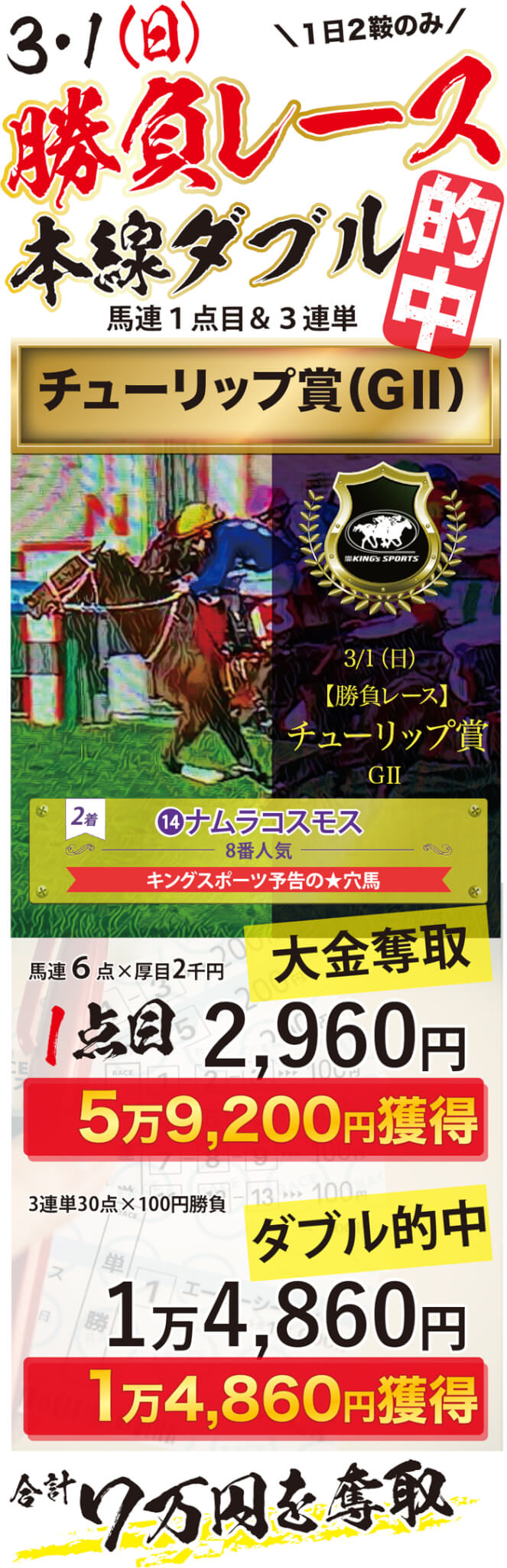 やりました!3月競馬の開幕となった先週、いきなり注目の重賞(勝負レース)で大勝利です!