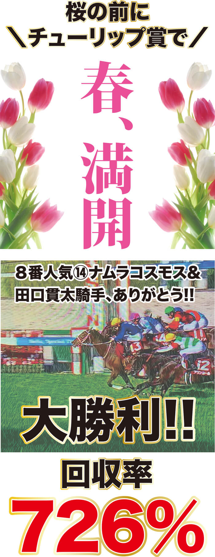 阪神11レース【チューリップ賞】におきまして、1週前の段階から有料会員様にイチオシした8番人気の☆穴馬ナムラコスモスが堂々2着に激走!