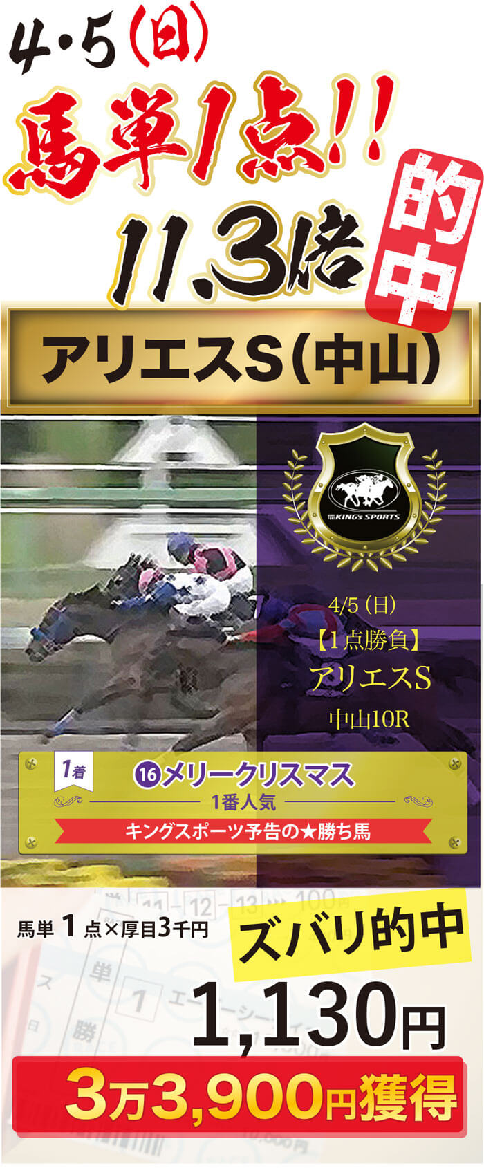はじめまして!私たちは1981年の創業以来、40年間、予想一筋で勝負をして参りました「キングスポーツ」です。 当ページをご覧を頂き、ありがとうございます!!