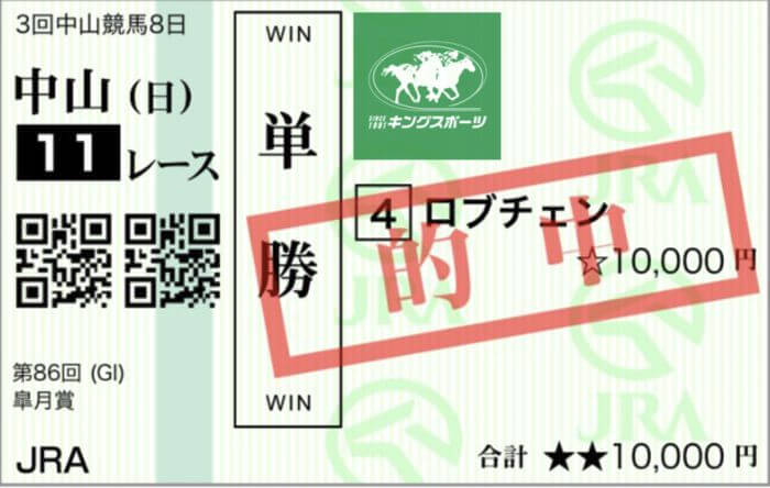 先日のG1【桜花賞】での馬連1,570円の的中に続いて、先週のG1【皐月賞】でも「単勝1点&不動の軸馬」に指名した4番ロブチェンが堂々の優勝!