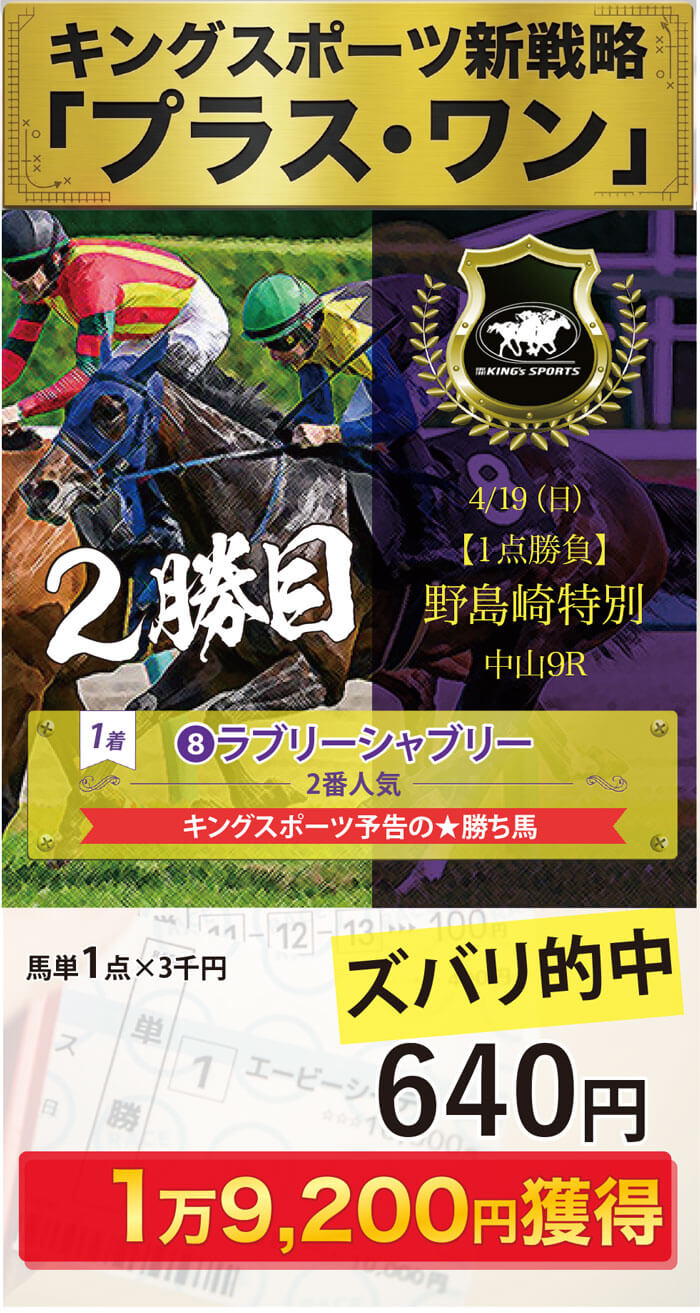 余計な馬券を買わせずに、再び皆さまを「キングプラスワン」を中心に、歓喜の瞬間へと導きます。熱い週末を!