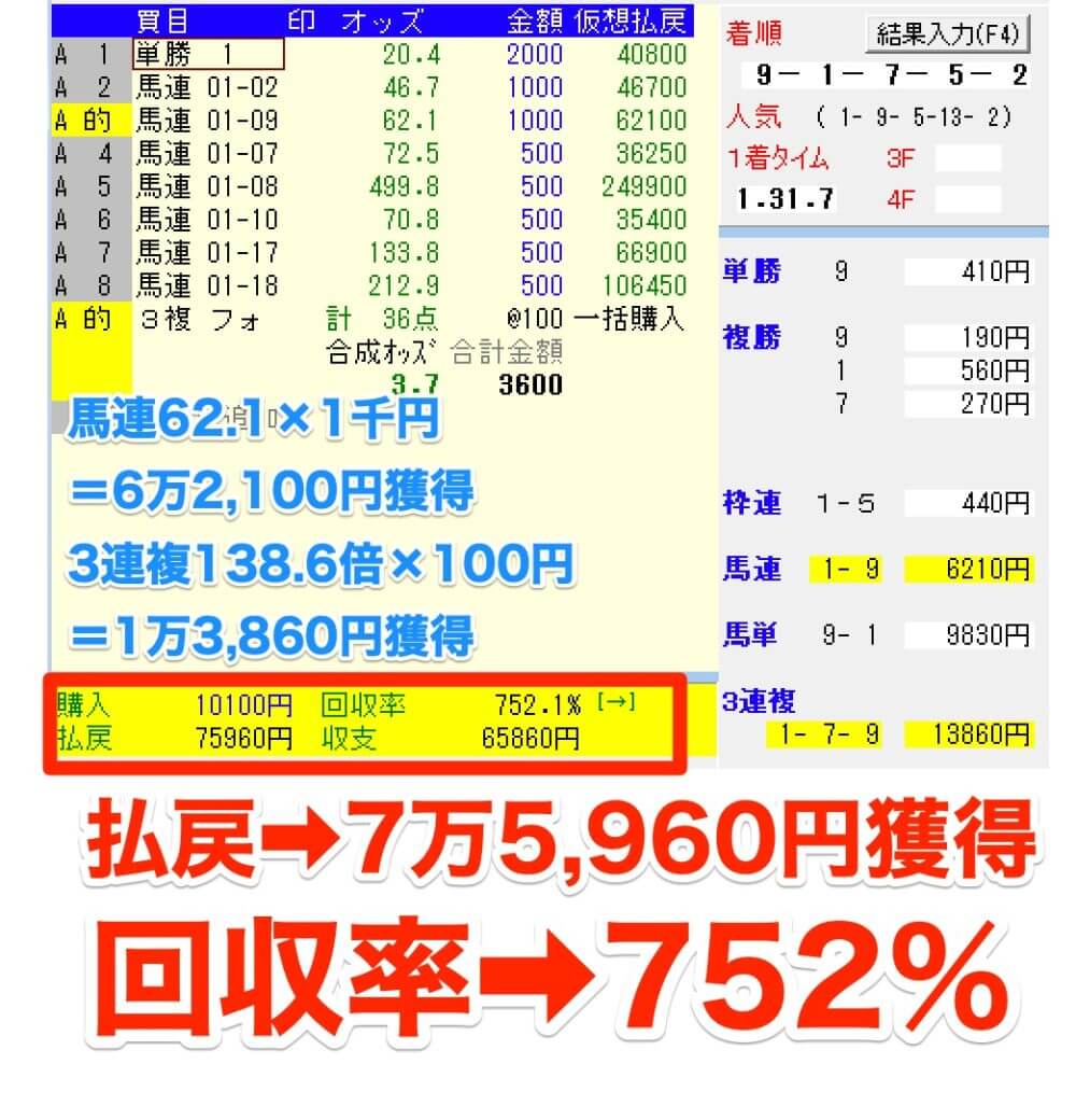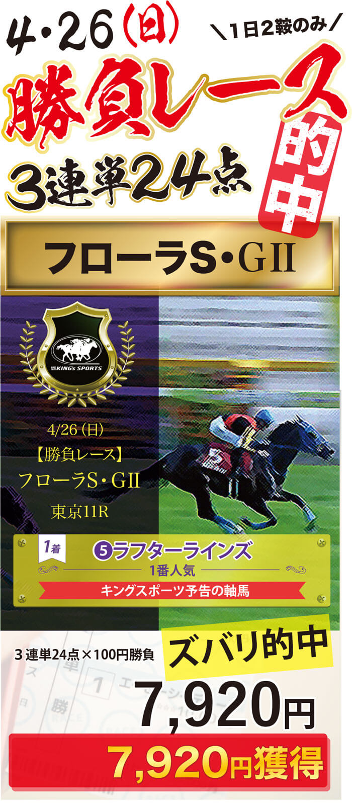 【マイラーズC】では予告の軸馬で「9番人気」の大穴☆ドラゴンブーストが堂々2着に激走!なんと馬連6,210円の好配当&3連複でも万馬券をゲットし、回収率は752%!そして、ラストの【フローラS】もキッチリと狙い撃ちし、3連勝を決めたのでした。