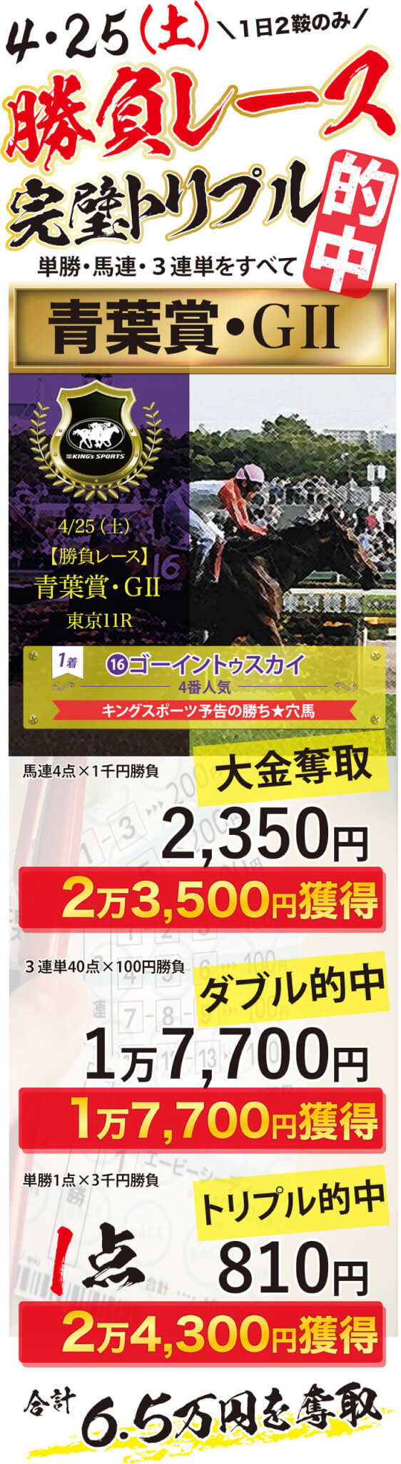 (土)【青葉賞】では不動の軸馬で4番人気のゴーイントゥスカイが堂々の優勝!単勝810円&馬連2,310円&3連単万馬券の「トリプル的中」を達成。このレースの回収率595%を達成したかと思えば(日)はさらに凄い!
