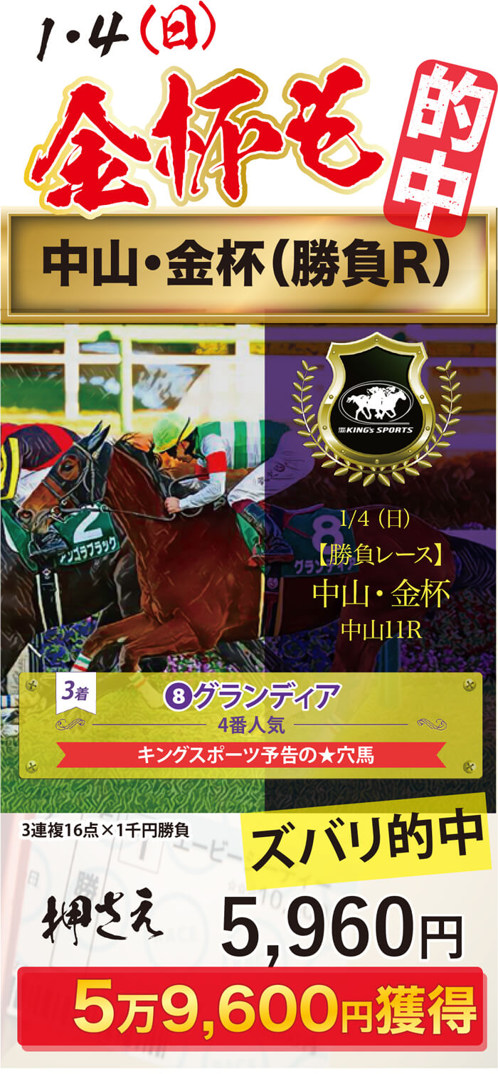 なんと1点勝負でのトリプル的中を2連発です!!またキングS得意の【中山金杯】も押さえの3連複で5,960円を獲りました。