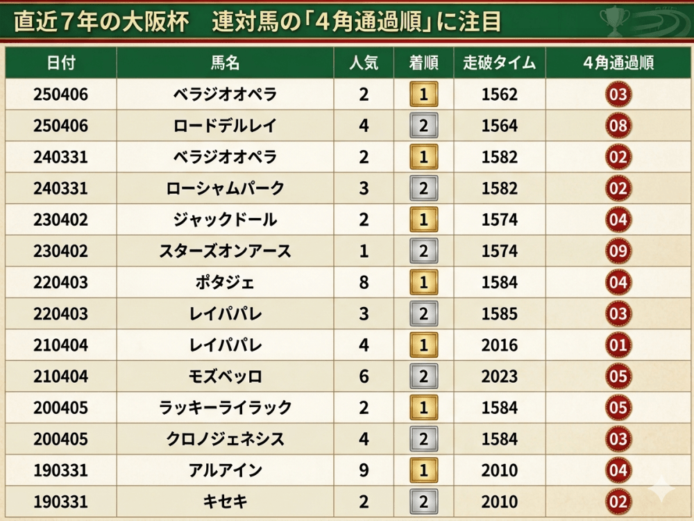 実際、直近7年の連対馬14頭中、なんと12頭は4角を5番手以内で通過している。