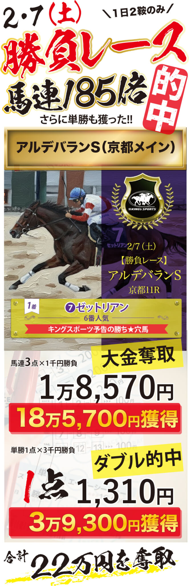 ㊗️2/7(土)勝負レース速報→この破壊力を見たか!馬連わずか3点で「驚愕の185倍的中」🎉さあ(日)も勝つぞ!
